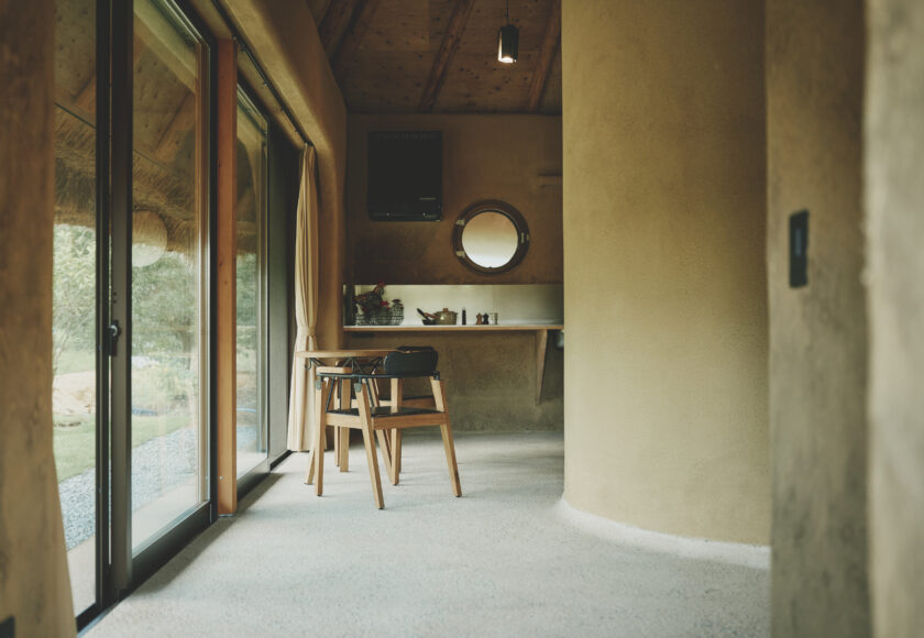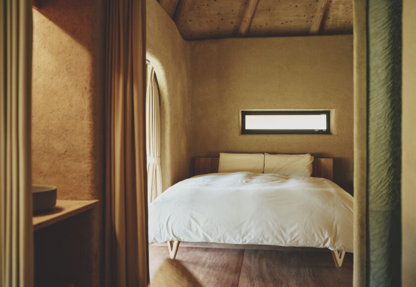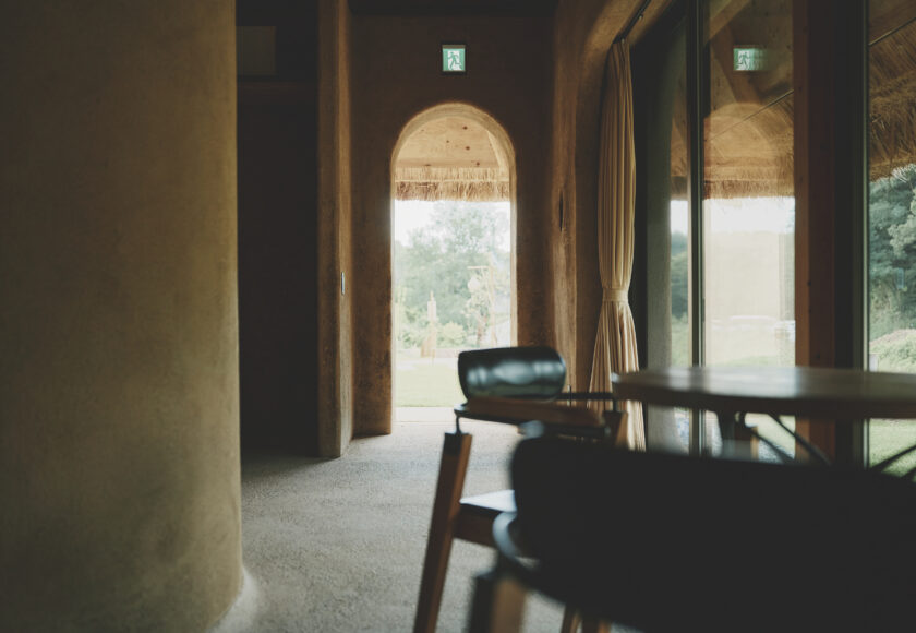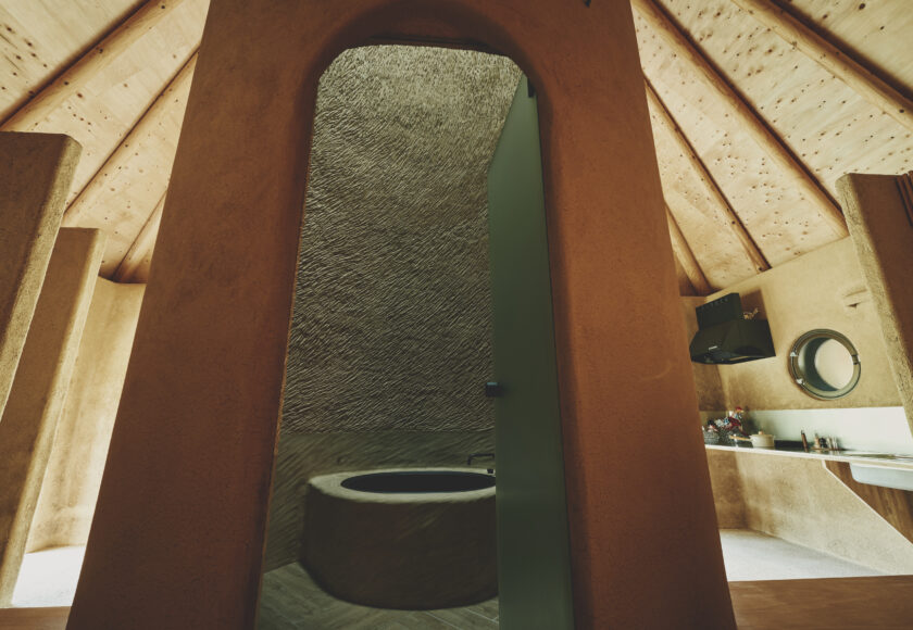 Tsuchikayan, crafted from earth, bamboo, and straw born from life on Awaji Island. A central earthen tower (bath) gently segments the space, while walls made of straw, bamboo, and earth softly envelop the whole. Enjoy this architecture with its continuous flow of space.