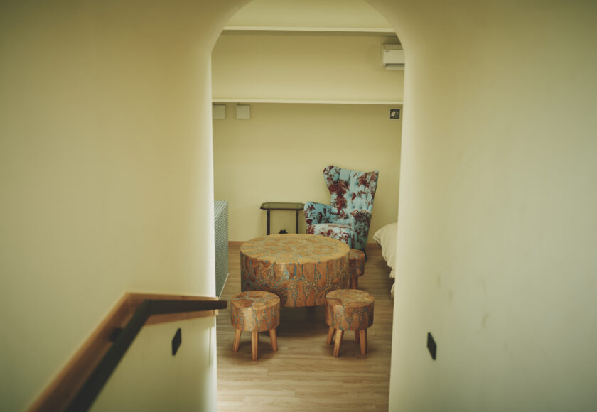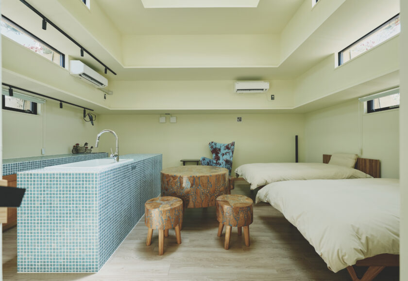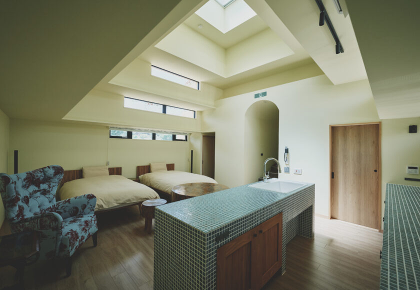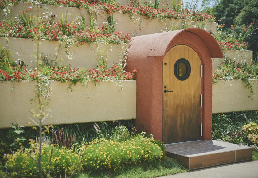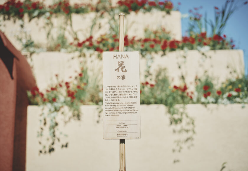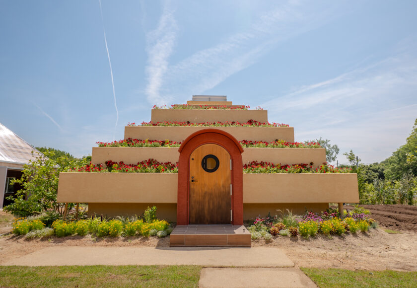 A pyramid-shaped structure covered in flowers. It was built to evoke the image of a mountain of flowers. The interior is semi-underground with an earthen atmosphere, and light streaming in through the skylight at the building’s apex pleasantly illuminates the space.