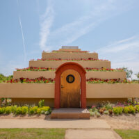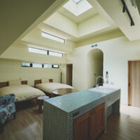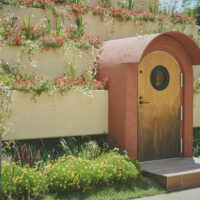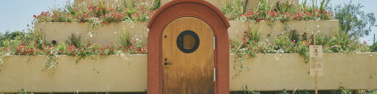 A pyramid-shaped structure covered in flowers. It was built to evoke the image of a mountain of flowers. The interior is semi-underground with an earthen atmosphere, and light streaming in through the skylight at the building’s apex pleasantly illuminates the space.